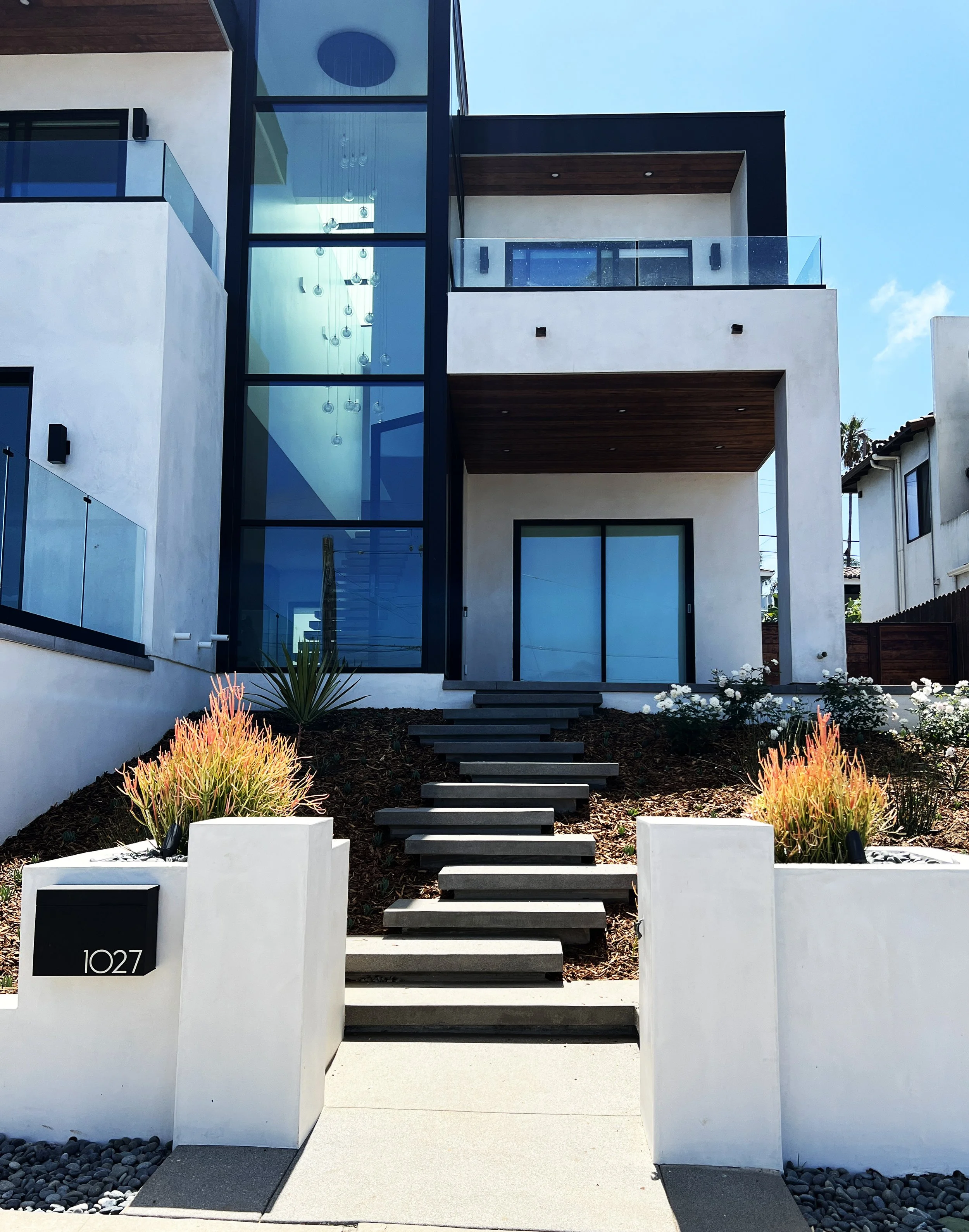 This project was for a client in the Ocean Beach / Sunset Cliffs area of San Diego who had a beautiful modern newly remodeled house and was seeking a new landscape design to match. The concept meetings went harmoniously and smooth, and we decided on topcast concrete with multi-size squares / rectangles for the hardscape along with an avant-garde staggered floating step stairwell in the front yard and semi-modern style planting complimenting synthetic turf areas, a crushed stone Zen area on the North side, and black mexican beach pebble in most of the planters.